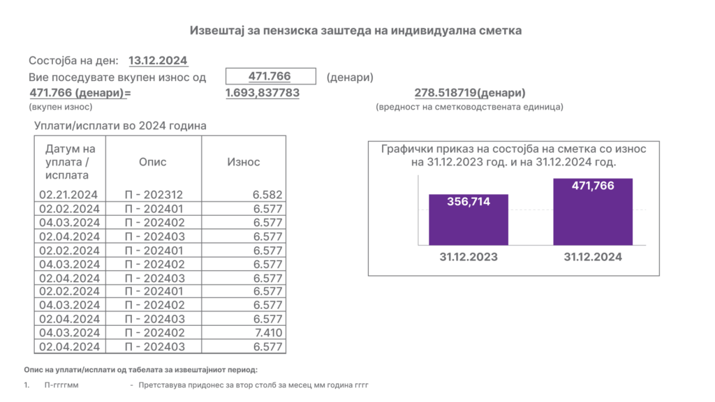 Во овој годишен извештај за вашата пензиска заштеда се содржани сите информации за тоа колку средства имате на вашата пензиска сметка, каде се инвестирани и каков принос е остварен во текот на изминатата година.