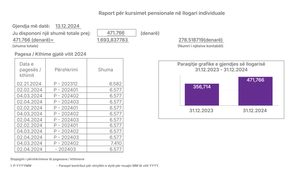 Në këtë raport vjetor për kursimet tuaja pensionale përfshihen të gjitha informacionet lidhur me shumën e mjeteve që keni në llogarinë tuaj pensionale, mënyrën se si ato janë investuar dhe çfarë kthimi është realizuar gjatë vitit të kaluar.